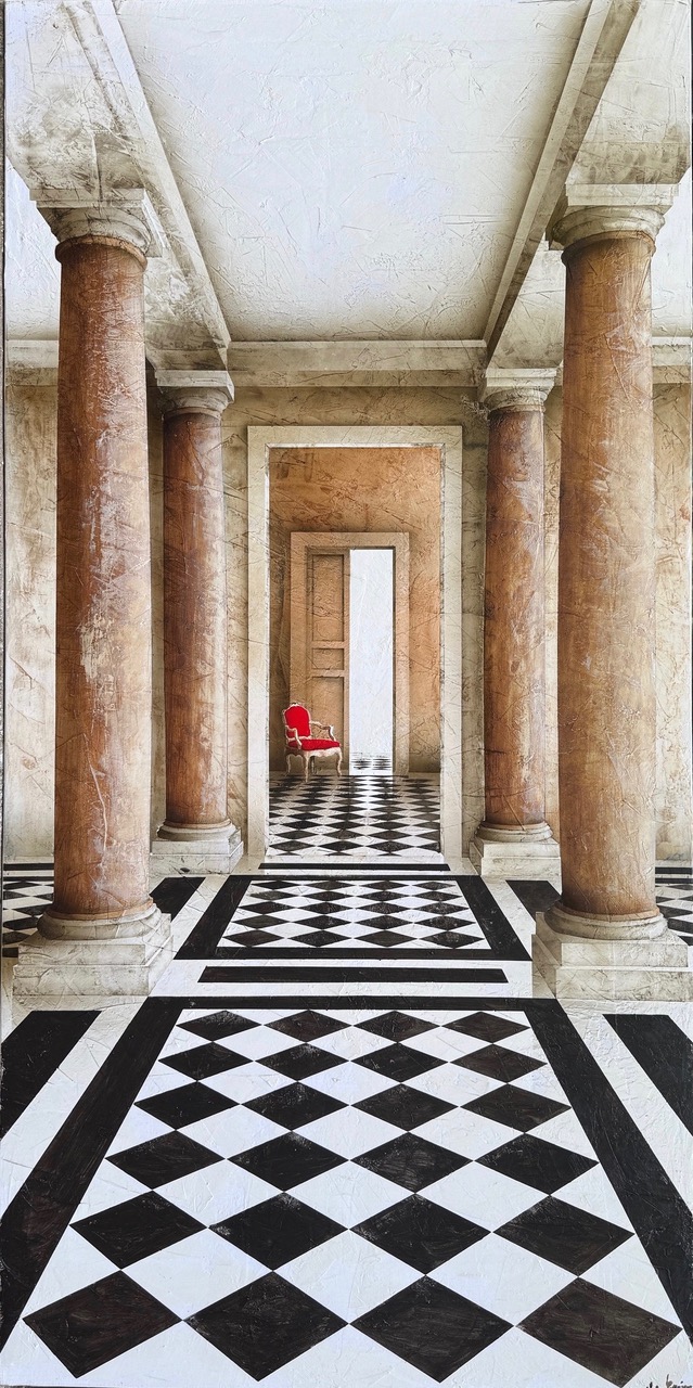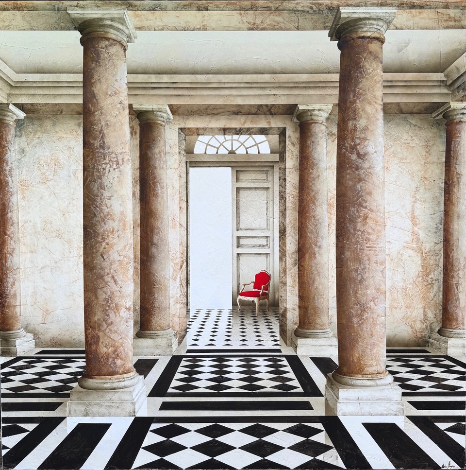 Gazier prepares his blank canvas’s with a primer called gesso; a mineral based substance that contains marble. This technique gives his paintings a unique texture. The paintings of Alain Gazier show images of the past with the faithfulness of the present. The walls whisper songs from the past, the stones breathe, the marble, the stairways, the columns and a divine light that comes from the windows. Pure imagination from an artist that dreams with beauty. He invites us in to this world of silent interior’s, where he plays with the light and the perspective. Let us come and visit this magic theatre of an exclusive artist.