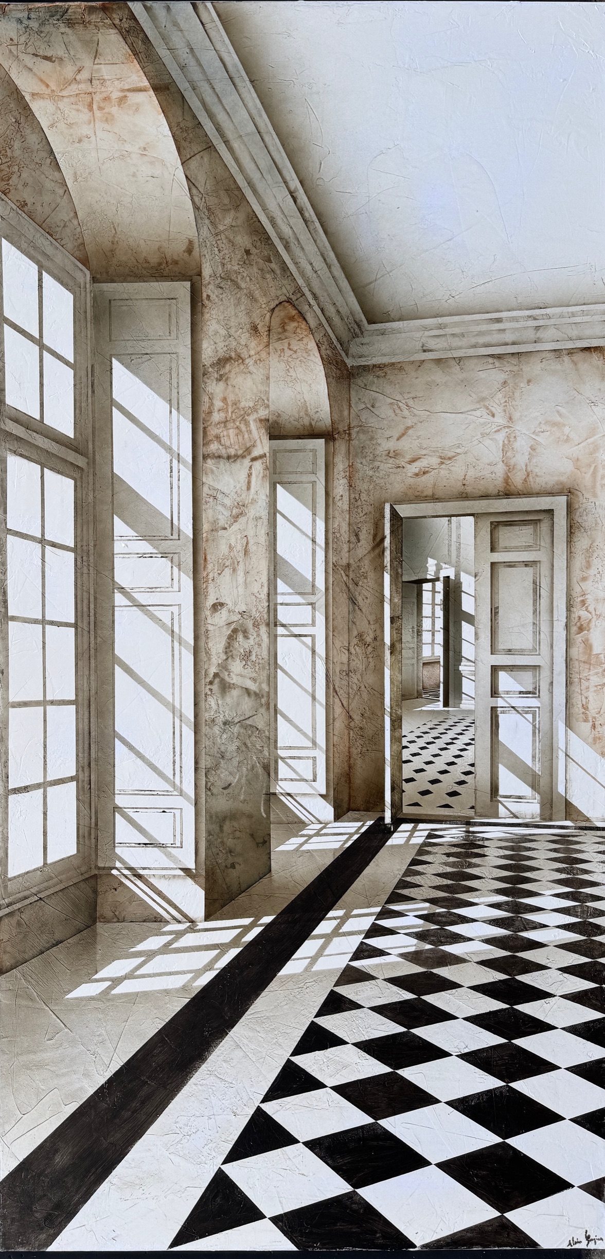 Alain Gazier, né en 1956 à Paris, traite la perspective avec une rigueur exemplaire. Sa maîtrise des points de fuite, des proportions, des projections et des plans rappelle la précision d’une épure d’architecte. Pourtant, l’effet le plus saisissant naît du rythme linéaire du carrelage, à la fois régulier et subtilement troublé par les accidents de matière que l’artiste superpose avec virtuosité.