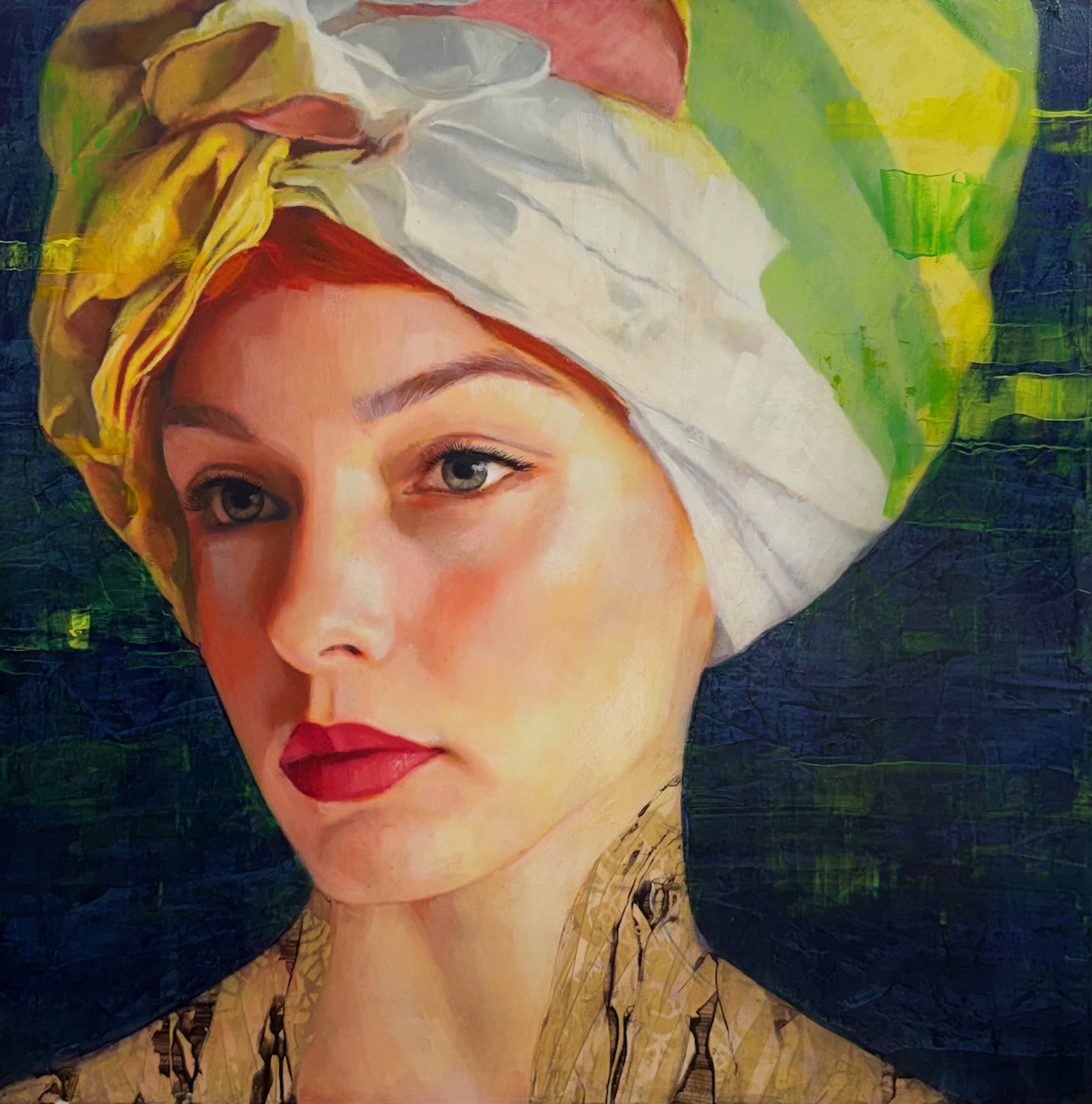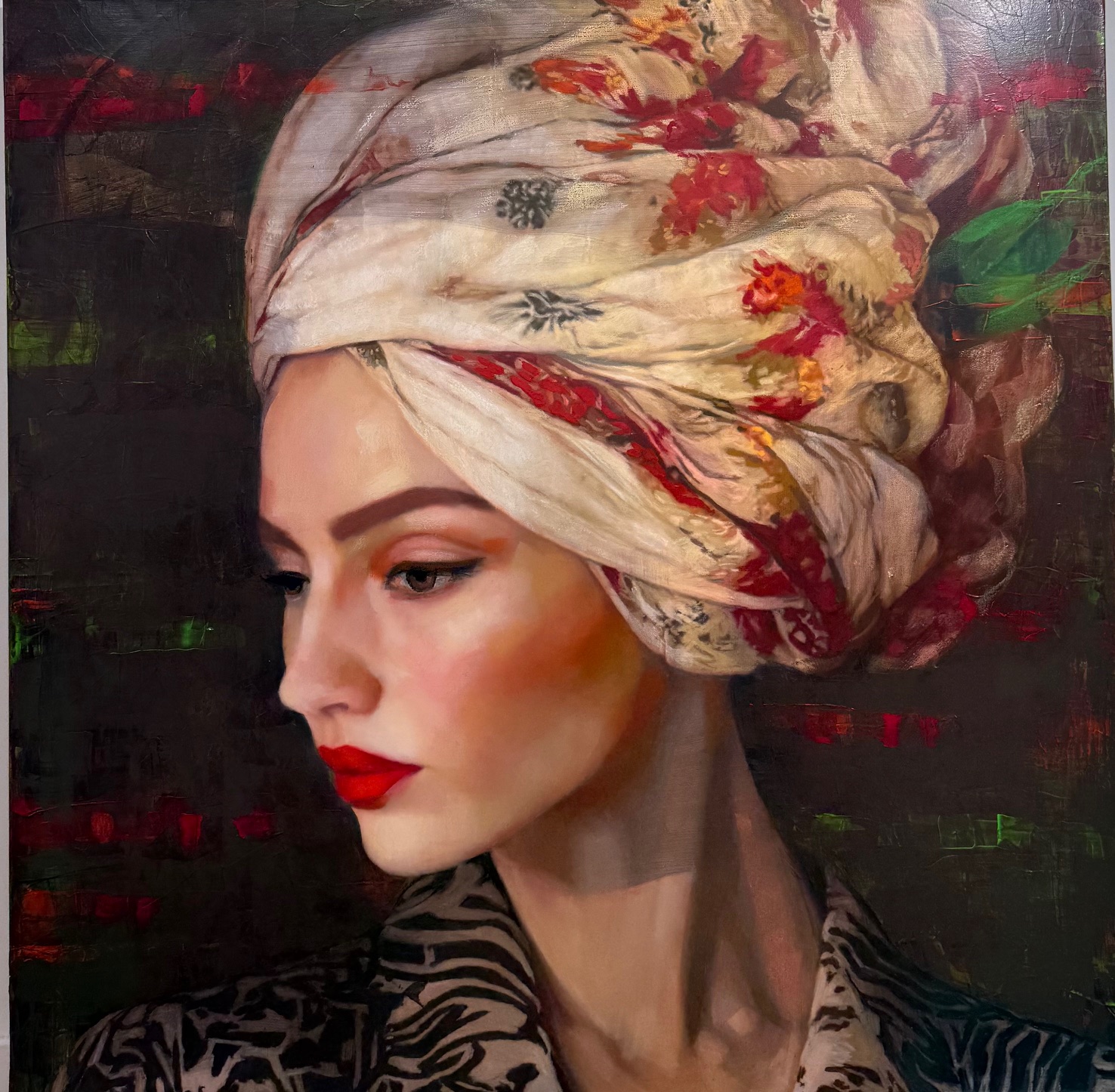 Considérées comme abstraites–figuratives, les peintures créées par Richard Burlet sont nées d’une inspiration française par inclination et viennoise par influence. Les images complexes des peintures figuratives de Burlet rendent hommage à une tradition artistique qui régnait à Vienne à la fin du XIXe siècle. L’art, l’architecture et le design de «l’âge d’or» de Vienne, ainsi que les très appréciées œuvres de Gustav Klimt, ont une grande influence sur l’œuvre de Burlet. Les peintures de Burlet sont des compositions colorées à base de collage et de peinture à l’huile. Chacune affiche un brillant patchwork de détails ornementaux qui n’embellit pas simplement l’oeuvre, mais en devient le contenu. Sa palette reflète souvent son affinité pour le rouge et le violet – des couleurs fortes – et il aspire à «un contraste de couleurs, de chaleur, un contraste entre des visages délicats et gracieux et un jeu de couleurs intense et puissant». Pour Burlet, l’interaction de la figure et de l’arrière-plan, de la planéité et de la profondeur, de l’objet et de l’image est la clé pour rehausser l’expérience de ses créations. Ses peintures évoquent un état de rêve et de flottement dans lequel la fantaisie liquéfie le monde, la teintant et la pliant à ses propres désirs. C’est dans cette approche de ses œuvres que les peintures de Burlet ont une affinité avec les études figuratives des plus classiques, tout en évoquant la nature psychédélique de l’art et du design des années 60’s. Les œuvres figuratives et sensuelles de Burlet ont une qualité abstraite obtenue grâce à son utilisation du collage et de la peinture épaisse sur toile. Les images sont plates, mais les couleurs superposées donnent une dimension plus riche. En appliquant un feuillage en or de 24 carats et de l’argent, il donne le ton et la texture de la toile. Il utilise ainsi l’or et l’argent “pour sa lumière – car aucune couleur ne peut rivaliser avec cet effet métallisé. C’est un élément qui n’appartient pas naturellement à la peinture et qui mérite donc d’essayer de l’inclure». Un autre «matériel» avec lequel Burlet travaille est la mémoire. “Plus les souvenirs sont éloignés, plus ils deviennent intéressants, car ils sont déformés par le temps et la vie. Ils réapparaissent à travers certaines couleurs, certaines formes, même s’ils restent flous.» L’art est à la fois classique et exotique, sensuel et apprivoisé. Les personnages apparaissent comme dans un rêve, les couleurs se mêlent au collage pour créer à la fois une ambiance et une surface multidimensionnelle.